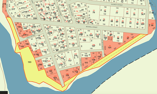 Lot 189 is in yellow. 3.15 acres that spreads over the southern tip of French Island. The tax map lists the City of Old Town as the owner, but this is incorrect. The previous owner of the land abandoned it in the 1930's. Landowners in the orange lots have a claim on this abandoned land.